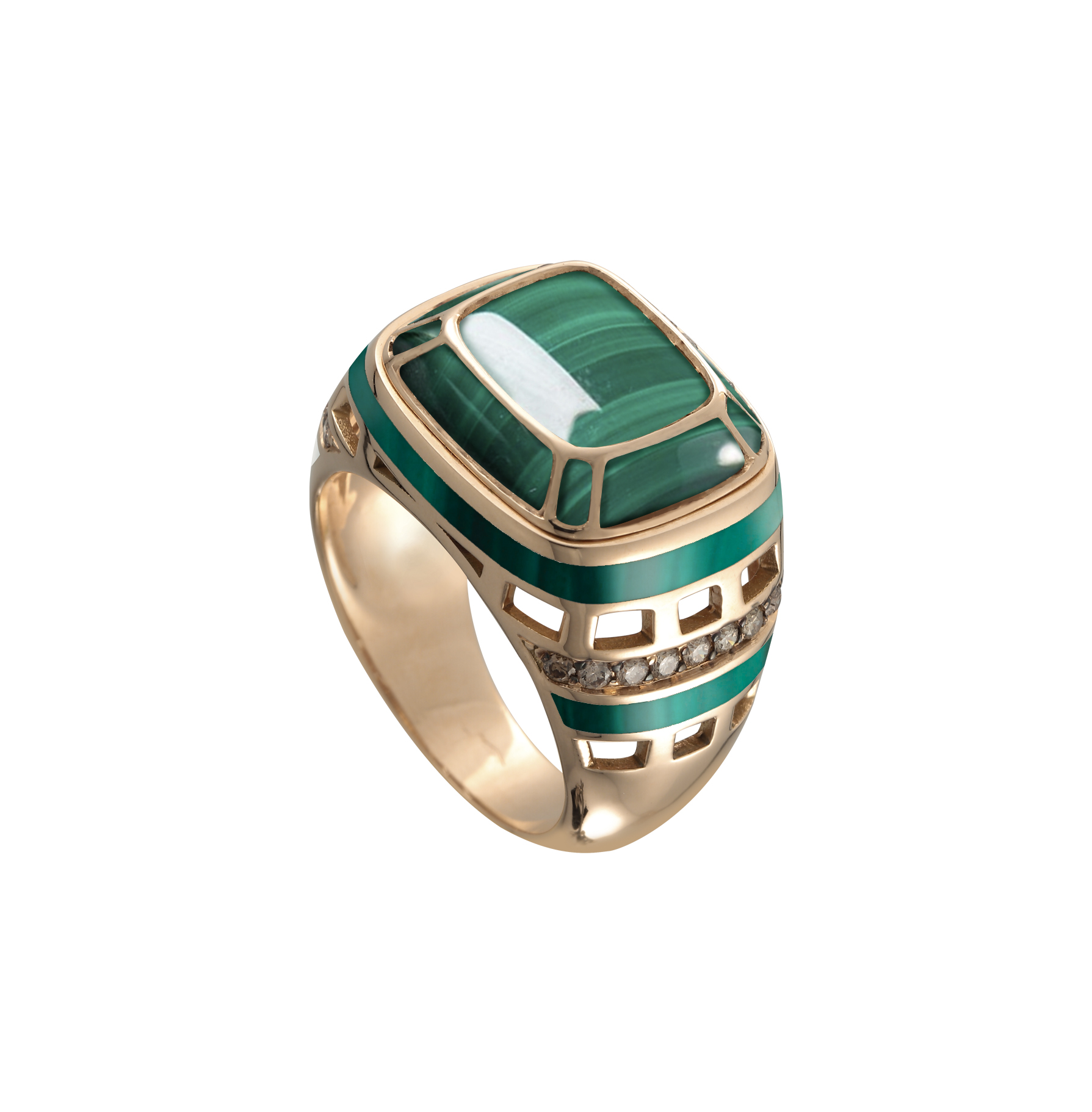 RING SQUARE CAGE MOTIF WITH MALACHITE AND BROWN DIAMONDS